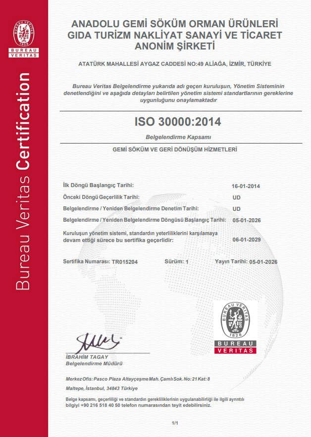 ISO9001:2015 Kalite, ISO14001:2015 Çevre, ISO45001:2018 İş Sağlığı ve Güvenliği ile ISO30000:2009 Gemi Geri Dönüşüm entegre yönetim sistemlerinin, Gemilerin Emniyetli ve Çevreye Uyumlu Geri Dönüşümü Hakkında Hong Kong Uluslararası Sözleşmesi ile Avrupa Birliği Gemi Geri Dönüşüm Yönetmeliği gereklerini yerine getirmeyi taahhüt etmektedir.